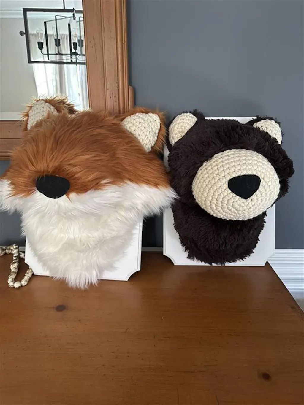 This Fox Head Wall Mount is made with faux fur, polyester stuffing, yarn, felt and wood.