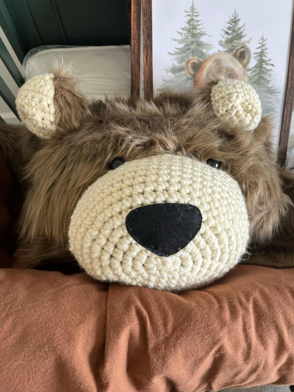 This Bear Rug for Nursery is made with faux fur, polyester stuffing, yarn, and felt.
