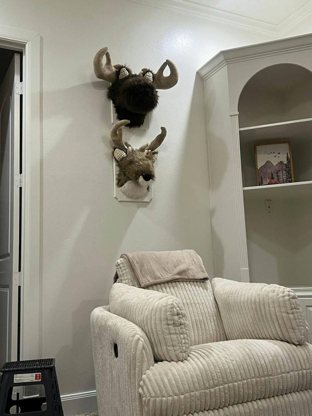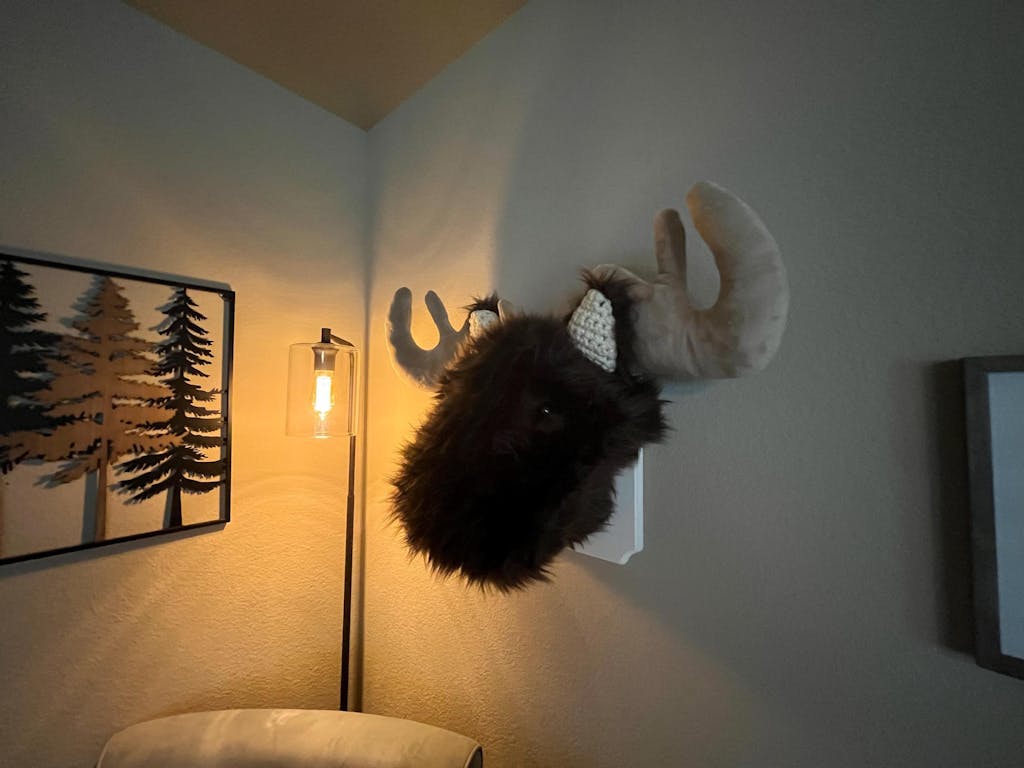 This Stuffed Moose Head Wall Mount is frequently used to decorate nurseries, big kid bedrooms, playrooms, and family rooms.