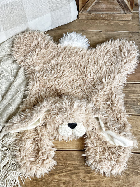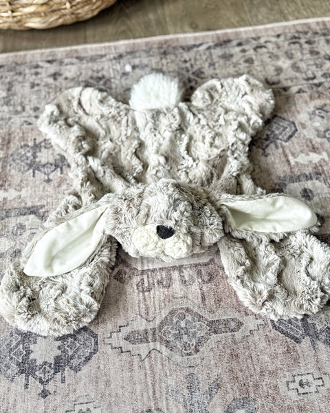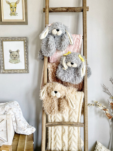 ClaraLoo Bunny Lovey. This is a double-sided faux fur lovey with a stuffed head. This charming lovey features a white tail and crochet muzzle.