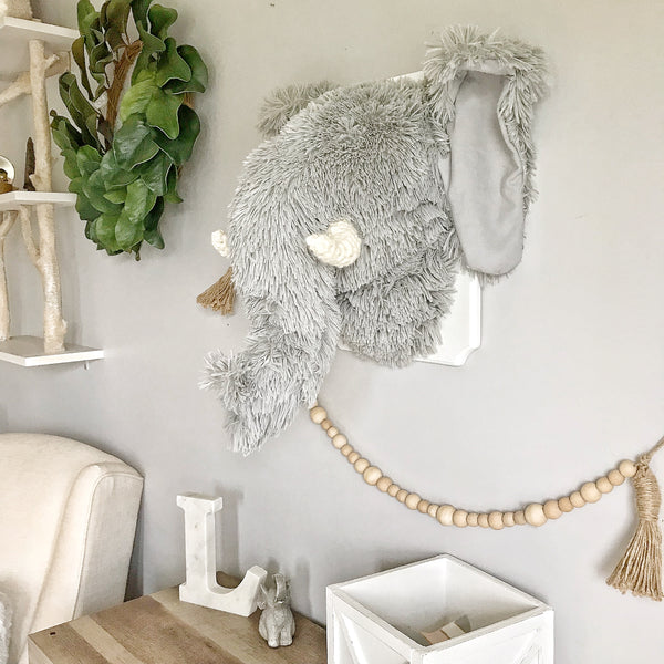 Bring a safari adventure into your nursery with this charming Elephant Wall Mount. The ClaraLoo plush Elephant Wall Mount is made of soft gray faux fur with crocheted tusks and a crocheted snout. He rests on a wooden plaque that has been painted white. Mounting hardware is already installed on the plaque. This handmade plush elephant is the perfect wall decor for a safari, jungle, or zoo themed nursery or big kid bedroom. No need to hunt for unique decor, this elephant mount has got you covered!