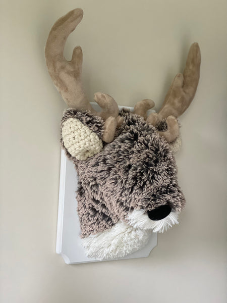 Take your nursery decor to new heights with our Deer Wall Mount! This ClaraLoo plush Deer Wall Mount is made of brown frosted faux fur with ivory accents and crochet ears. He rests on a wooden plaque that has been painted white. Mounting hardware is already installed on the plaque. This charming plush deer will surely add a touch of adventure to your woodland, forest, or hunting themed nursery or big kid bedroom. Bring out your wild side and elevate your space with this unique statement piece!