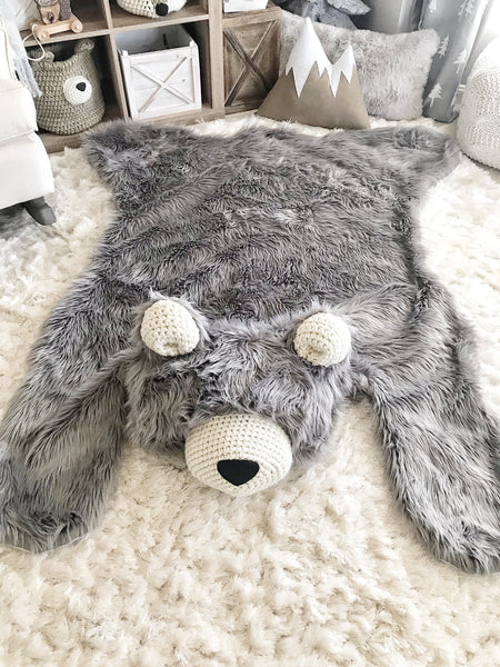 ClaraLoo Extra Large Gray Grizzly Bear Rug. This plush faux fur rug is lined with a soft flannel fabric and features crochet ears and muzzle.