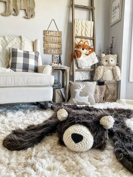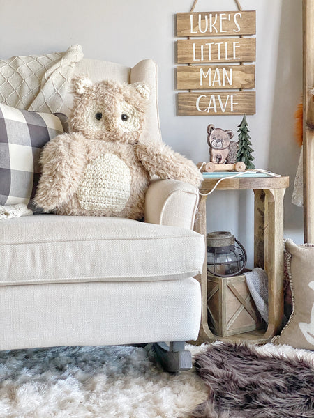 Meet ClaraLoo’s playful and unique owl plush that will add a touch of whimsy to any woodland nursery. With handmade crochet accents and a soft beige exterior, this plush is one-of-a-kind. Perfect for snuggles and giggles!