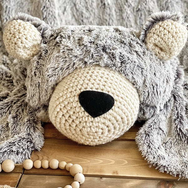 ClaraLoo Large Gray Frosted Minky Bear Rug. This plush faux fur rug is lined with a soft flannel fabric and features crochet ears and muzzle.