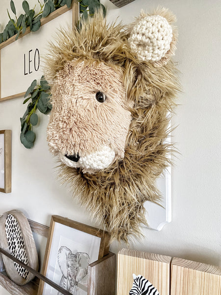 Warm your walls with a ClaraLoo Wall Mount! This plush ClaraLoo Lion Wall Mount is made of soft tan faux fur, surrounded by a luxurious plush mane. This charming lion features crochet ears and a crochet muzzle. He rests on a wooden plaque that has been painted white. Mounting hardware is already installed on the plaque. This handmade treasure is the perfect wall decor for a safari, zoo, or hunting themed nursery or big kid bedroom.